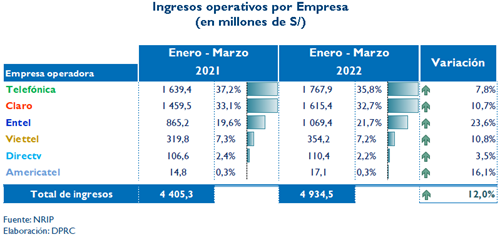También indica que, respecto a los ingresos de Servicios Móviles, estos se incrementaron en 13,1 %, como consecuencia de la mayor cantidad de líneas móviles en servicio, las cuales pasaron de 40,2 millones en marzo de 2021 a 41,8 millones en marzo del 2022.