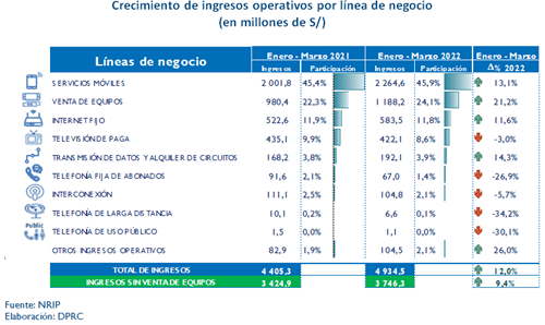 De acuerdo al informe Análisis del Desempeño Financiero del Sector Telecomunicaciones, elaborado por la Dirección de Políticas Regulatorias y Competencia (DPRC) del ente regulador, el resultado se sustentó por los mayores ingresos registrados en las líneas de negocio Venta de Equipos, Servicios Móviles e Internet fijo, en los tres primeros meses de año.