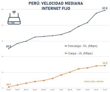 La velocidad promedio de descarga (bajada) en el servicio de internet fijo de banda ancha registró un crecimiento sostenido en Perú durante el año 2022. Según un reciente reporte de Ookla, empresa global especializada en mediciones del rendimiento del acceso a internet, ese indicador pasó de 43.21 Mbps (megabit por segundo) observados en enero hasta los 67.57 Mbps registrados en diciembre, lo que representó un aumento de 56 % al cierre del año, informó el Organismo Supervisor de Inversión Privada en Telecomunicaciones (OSIPTEL).