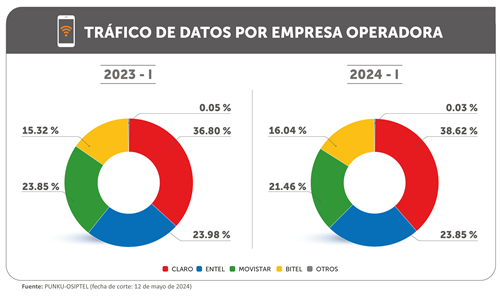 Con ello, Claro mantiene el liderazgo en participación de mercado, en términos del tráfico de datos de internet móvil al primer trimestre de 2024 con 38.62 %, seguido de Entel (23.85 %), Movistar (21.46 %) y Bitel (16.04 %).