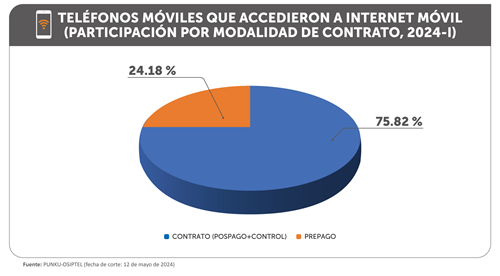 Así, en el periodo analizado, el 75.82 % del tráfico cursado de datos móviles se registró en teléfonos móviles bajo la modalidad contrato, mientras que el segmento prepago acumuló el 24.18 %.