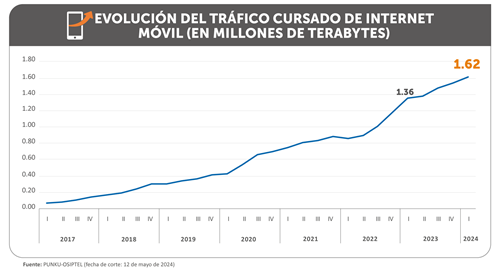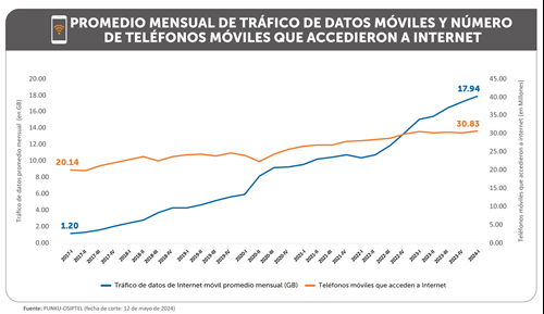 El consumo de datos de internet móvil viene creciendo en mayor medida que el número de teléfonos móviles que accedieron a internet, esto como resultado de la mayor demanda por este tipo de servicio. Así, durante el primer trimestre de 2024, el tráfico mensual promedio de datos móviles cursado por teléfono móvil en este periodo fue de 17.94 gigabytes (GB), lo que representó un salto de 18.82 % en comparación al mismo periodo del año anterior, informó el Organismo Supervisor de Inversión Privada en Telecomunicaciones (OSIPTEL).