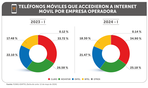 A marzo de 2024, Claro es la empresa que registra la mayor participación de mercado (34.90 %) en términos del número de teléfonos móviles que accedieron a internet móvil, seguido de Movistar con el 25.18 %, Entel (21.47 %), Bitel (18.30 %), y otras empresas (0.14 %).