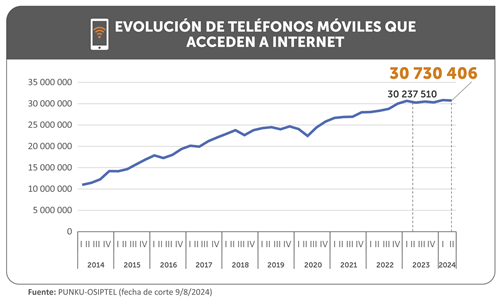 El análisis realizado por la Dirección de Políticas Regulatorias y Competencia (DPRC) del OSIPTEL, también evidenció el crecimiento de 1.63 % en el número de teléfonos móviles que accedieron a internet, que pasó de 30.24 millones en el primer semestre de 2023 a 30.73 millones a junio del presente año, representando el 73.34% del total de líneas móviles activas al cierre del mencionado periodo.