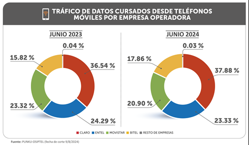 Con ello, Claro continúa encabezando la participación de mercado, en términos del tráfico de datos de internet móvil cursado desde teléfonos móviles, con 37.88 %, seguida de Entel (23.33 %), Movistar (20.90 %), Bitel (17.86 %) y otras empresas (0.03%).