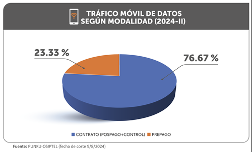 Es importante anotar que, durante el segundo trimestre de 2024, el 76.67 % del tráfico cursado de datos móviles correspondió a teléfonos bajo la modalidad contrato (pospago y control), mientras que el uso de datos desde teléfonos de la modalidad prepago obtuvo el 23.33 % de participación.