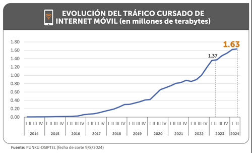 Tal como se evidencia en el portal informativo PUNKU (https://punku.osiptel.gob.pe/), otro indicador que confirma que la demanda por conectividad continúa en ascenso fue el tráfico de datos móviles cursado desde teléfonos móviles, que durante el segundo trimestre del 2024 alcanzó 1.63 millones de terabytes (TB), 18.91 % más que lo registrado en el mismo periodo del año anterior.