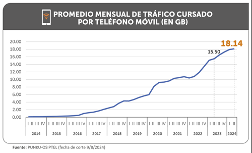 Como resultado de la mayor demanda de conectividad, el consumo de datos móviles continúa creciendo. Así, el tráfico de datos promedio mensual desde teléfonos móviles alcanzó los 18.14 gigabytes (GB), en el segundo trimestre de 2024, lo que representó un crecimiento de 17% respecto al promedio registrado en similar periodo del año previo, informó el Organismo Supervisor de Inversión Privada en Telecomunicaciones (OSIPTEL).