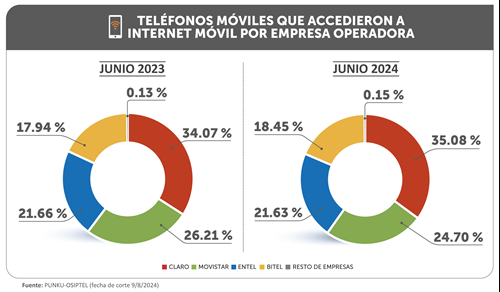 De esta manera, Claro conservó el liderazgo y se mantiene como la empresa con la mayor participación de mercado (35.08 %) en términos de teléfonos móviles que accedieron a internet móvil, seguido de Movistar con el 24.70 %, Entel (21.63 %), Bitel (18.45 %) y otras empresas (0.15 %).