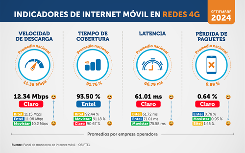 En el desagregado por indicadores, Claro tuvo el mejor desempeño en velocidad promedio de descarga en redes móviles 4G con 12.34 Mbps (megabits por segundo), por encima de Bitel (11.15 Mbps), que desplazó hasta el tercer lugar a Entel (11.08 Mbps). Más atrás se ubicó Movistar (10.2 Mbps).