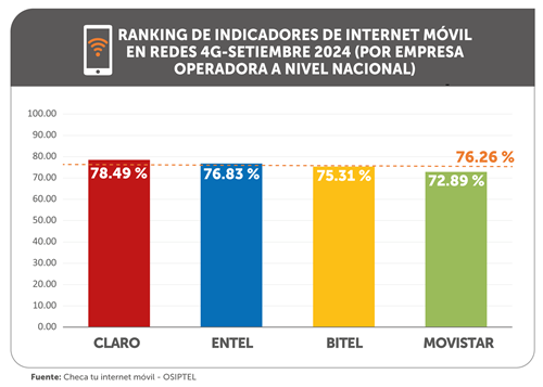 De acuerdo a la información publicada en la herramienta digital Checa tu internet móvil (https://checatuinternetmovil.osiptel.gob.pe/), Claro fue la empresa operadora con mejor desempeño, alcanzando un promedio de 78.49 %, seguida de Entel (76.83 %), ambas por encima de la media mensual. A continuación, se ubicaron Bitel (75.31 %) y Movistar (72.89 %).