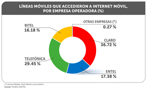 Así, la empresa operadora Claro concentró el 36.72 % de la participación total de líneas móviles que accedieron a internet móvil, seguida de Telefónica (29.45 %), Entel (17.38 %) y Bitel (16.18 %).