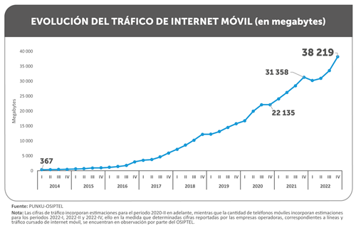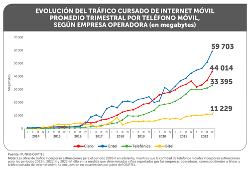 En cuanto al tráfico de internet móvil promedio por teléfono móvil, dicho indicador pasó de poco más de 31 gigabytes en el cuarto trimestre de 2021 a más de 38 gigabytes al cuarto trimestre de 2022, lo que implica un crecimiento de 21.88 % en apenas un año; y de 72.66% en dos años, siendo que al cuarto trimestre de 2020 se registraron alrededor de 22 gigabytes en el indicador descrito anteriormente. Asimismo, en comparación al primer trimestre del 2014, cuando el tráfico de internet móvil promedio era de apenas 367 megabytes por teléfono móvil a nivel nacional; ocho años después, el tráfico de internet móvil promedio aumentó en más de cien veces.