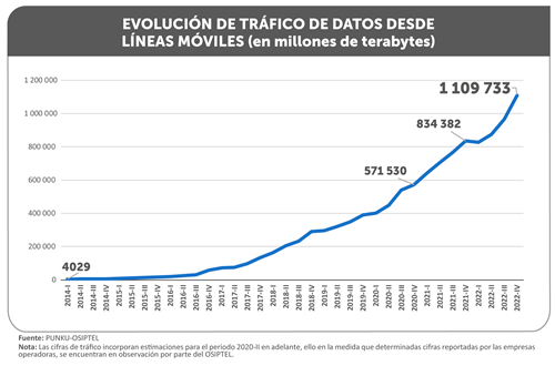 Durante el cuarto trimestre de 2022, el tráfico de datos reportado desde teléfonos móviles totalizó 1 109 733 terabytes, un 33 % más respecto a similar periodo de 2021, según informaron las empresas operadoras al Organismo Supervisor de Inversión Privada en Telecomunicaciones (OSIPTEL).