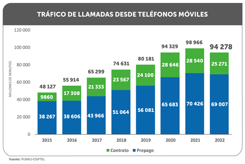 Al cuarto trimestre de 2022, el tráfico de llamadas desde teléfonos móviles fue de 94 278 millones de minutos, de los cuales el 73.20% correspondió a líneas móviles de la modalidad contrato (control + pospago), mientras que el 26.80 % correspondió a la modalidad prepago.