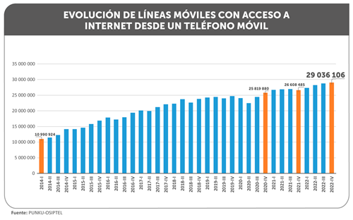 De acuerdo a la información publicada en el portal PUNKU, al cierre de 2022, la cantidad de teléfonos móviles que accedió a internet móvil superó los 29 millones, lo que representó un 9.12 % más que lo registrado en el mismo periodo de 2021 y 12.46 % más que lo reportado al cierre de 2020. El análisis también muestra un crecimiento de 164.18% respecto del primer trimestre de 2014.