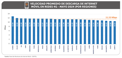 La evaluación determinó que diez regiones tuvieron promedios de velocidad de descarga por encima de la media nacional, siendo Tumbes (12.84 Mbps) la región con el internet móvil más veloz del país, superando los promedios del Callao (12.02 Mbps), Ica (11.90 Mbps), Lima (11.83 Mbps) y Amazonas (11.74 Mbps).
