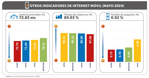 El indicador de latencia, que analiza si un contenido en línea se accede con mayor o menor retardo, obtuvo un promedio nacional de 72.83 ms (milisegundos), mientras que el tiempo de cobertura, que permite conocer el porcentaje promedio de tiempo en el cual estamos dentro de la cobertura de la tecnología 4G, lo que significaría el acceso a una mejor experiencia en navegación de diversos contenidos en ese periodo, promedió 89.03 %.