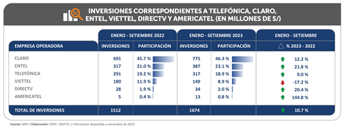 Con estos resultados, al cierre del tercer trimestre de 2023, Claro (con 46.3 %) se mantiene como la empresa con mayor participación a nivel de las inversiones del sector, seguida por la empresa Entel con el 23.1 %. Por su parte, Telefónica ocupó el tercer lugar, al representar el 18.9 % de las inversiones totales; a continuación, se ubicaron Viettel (8.9 %), Directv (2 %) y Americatel 0.8 %.