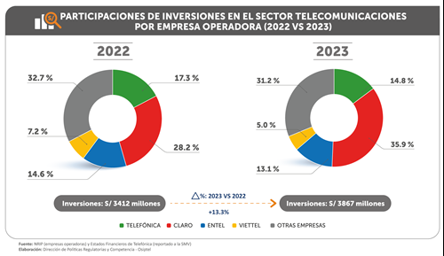 En el 2023, las inversiones de Claro representaron el 35.9 % del total de inversiones del sector telecomunicaciones; en tanto, las de Telefónica fueron el 14.8%; de Entel, 13.1 % y Viettel, 5 %.