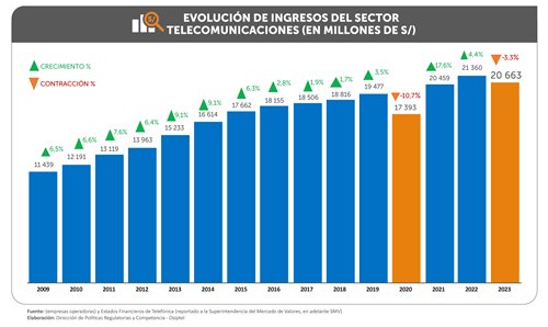 Los ingresos generados por el sector telecomunicaciones retrocedieron en 3.3 %, al pasar de S/21 360 millones en el 2022 a S/20 663 millones en el 2023, explicado básicamente por la reducción de ingresos proveniente de la Venta y alquiler de equipos.