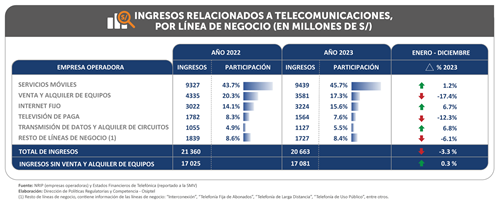 Sin embargo, cabe destacar que los ingresos del sector, sin considerar la línea de negocios Venta y alquiler de equipos, se incrementaron en un 0.3 % respecto a los ingresos registrados en el 2022, ello impulsado, principalmente, por los ingresos provenientes de los Servicios móviles e Internet fijo.