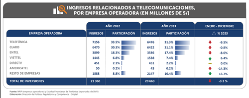 Los ingresos de las empresas Americatel, Telefónica, Entel y Claro registraron variaciones de -14.3 %, -9.5 %, -8.0 % y -0.8 %, y respectivamente. En tanto los ingresos de Viettel crecieron +6,4% y Directv mantuvo sus ingresos en niveles similares al registrado en el periodo anterior.