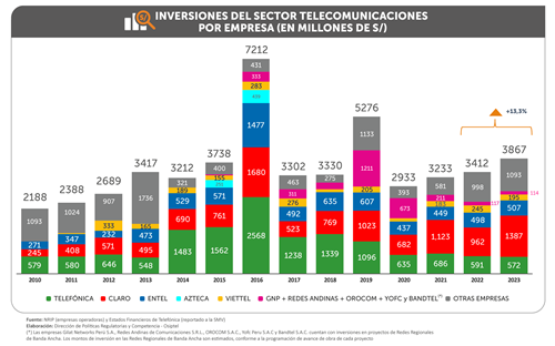 De acuerdo al informe Análisis del Desempeño Financiero del Sector Telecomunicaciones, elaborado por la Dirección de Políticas Regulatorias y Competencia del ente regulador, este incremento estuvo impulsado, principalmente, por el avance de las inversiones de Claro (+44.1 %), Entel (+1.7 %), Wi-Net Telecom S.A.C. (+66.1 %) y Pangeaco S.A.C. (+19.5 %), respecto al año anterior. En tanto, las inversiones registradas por Telefónica y Viettel disminuyeron 3.2 % y 20.7 %, respectivamente.