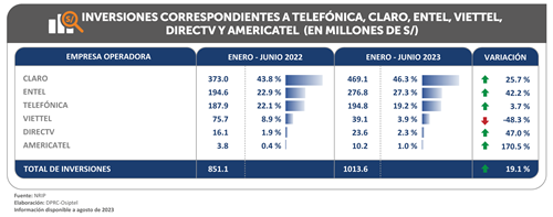 Con estos resultados, Claro (con 46.3 %) registró la mayor participación en las inversiones del sector al cierre del primer semestre de 2023, seguida por Entel (27.3 %). Por su parte, Telefónica ocupó el tercer lugar, al representar el 19.2 % de las inversiones totales, luego de registrar un ligero incremento de 3.7 % respecto al monto de inversiones registrado por esta empresa durante los seis primeros meses del 2022.
