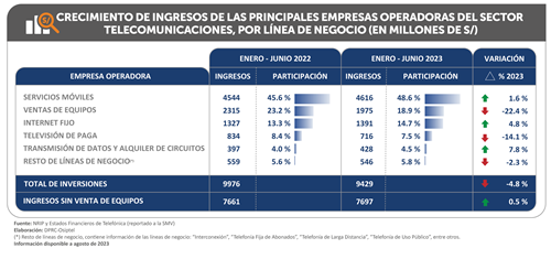 Durante los seis primeros meses de 2023, sin considerar Venta de equipos, los ingresos generados en conjunto por las principales empresas operadoras del sector telecomunicaciones se incrementaron en 0.5 % respecto al año anterior, impulsados por los mayores ingresos generados por las líneas de negocio Servicios móviles e Internet fijo.