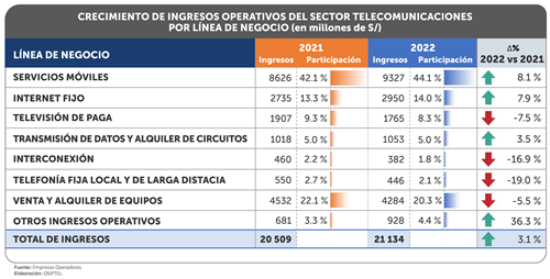 Los ingresos operativos de las empresas del sector telecomunicaciones siguen en ascenso, con cifras superiores a las registradas antes de la pandemia por el COVID-19. Así, en el año 2022, estos ingresos alcanzaron los S/ 21 134 millones, es decir, un incremento de 3.1 % en comparación a los ingresos operativos registrados en el año 2021.
