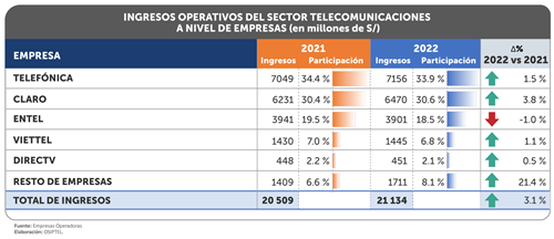 En el año 2022, las empresas con mayor participación a nivel de ingresos continuaron siendo Telefónica y Claro, las cuales registraron mayores ingresos asociado principalmente al incremento de sus ingresos en servicios móviles (+10.2 % y +7.9 %, respectivamente).