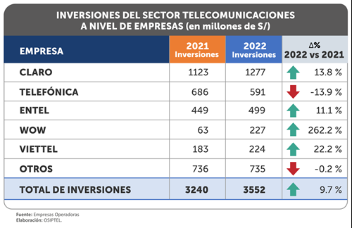 A nivel de participación por empresa operadora, las inversiones de Claro representaron el 36.0 % del total de inversiones del sector telecomunicaciones en el año 2022, 1.3 puntos porcentuales más en comparación con el año 2021. Le sigue Telefónica del Perú con 16.6 % (4.5 puntos porcentuales menos que el año anterior).