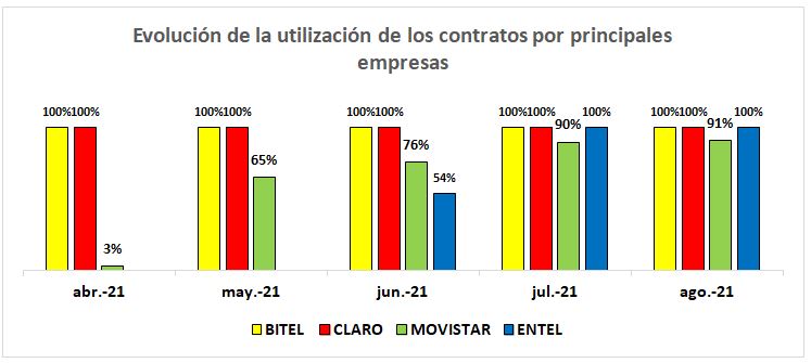 Las empresas Claro, Entel y Bitel indicaron que en julio y agosto emplearon los contratos cortos en todas sus contrataciones, siendo 1,42 millones de contratos cortos emitidos por Claro, seguidos por 1,19 millones de contratos cortos de Entel y poco más de 1,02 millones de contratos cortos de Bitel. En cambio, Telefónica informó que emitió 635 534 contratos cortos en julio y 626 858 contratos cortos en agosto, equivalentes al 90% y 91 % del total de sus contrataciones, respectivamente.