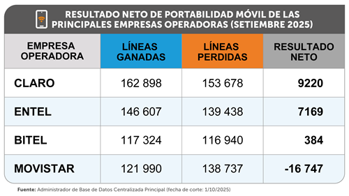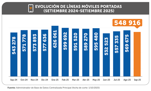 En setiembre de 2025, 548 916 líneas móviles cambiaron de empresa operadora a nivel nacional, lo que significó un incremento de 1.04 % respecto a las portaciones móviles registradas en el mismo periodo del año pasado (543 278), informó el Organismo Supervisor de Inversión Privada en Telecomunicaciones (OSIPTEL).