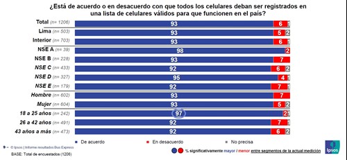 El 93 % de peruanos está de acuerdo con la medida que dispone que todos los equipos móviles se registren en una lista de celulares válidos (o lista blanca) para que funcionen en el territorio nacional, así lo revela una encuesta de Ipsos Perú, realizada por encargo del Organismo Supervisor de Inversión Privada en Telecomunicaciones (OSIPTEL).