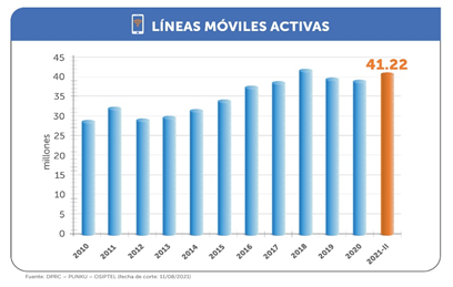 El servicio de telefonía móvil continuó su expansión en el mercado peruano al alcanzar más de 41,22 millones de líneas activas al cierre del segundo trimestre del año, un aumento de 11,2 % respecto a similar periodo del 2020, informó el Organismo Supervisor de Inversión Privada en Telecomunicaciones (OSIPTEL).