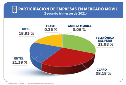 Este movimiento en líneas tuvo como resultado que la participación de mercado móvil en el segundo trimestre del año sea liderada por la empresa Telefónica del Perú (31,08 %), seguida por Claro (28,18 %), Entel (21,39 %) y Bitel (18,93 %). Las operadoras móviles virtuales Flash y Guinea Mobile reportaron un 0,36 % y 0,06 % de participación, respectivamente.