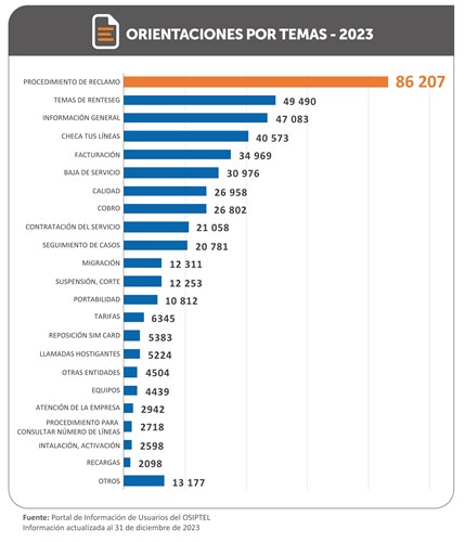 En la segmentación por temas, los usuarios solicitaron más orientaciones sobre el procedimiento de reclamo (86 207). Luego se ubicaron los temas referidos a Renteseg, como bloqueo y desbloqueo de equipos terminales móviles (49 490); información general (47 083); Checa tus líneas (40 573); facturación (34 969), y baja de servicio (30 976). En cuanto a las empresas operadoras, la mayor cantidad de consultas en el 2023 correspondió a usuarios de Movistar (227 762), seguido de Claro (63 329), Entel (58 808), Bitel (18 070), entre otros.