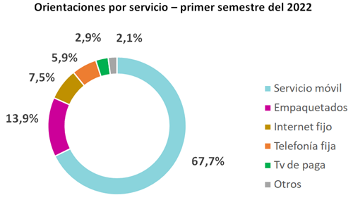 Según datos del Portal de Información de Usuarios del ente regulador, más de la mitad de las orientaciones que el OSIPTEL atendió a solicitud de los usuarios trataron sobre el servicio de telefonía móvil, 106 350 (67.7%), mientras que 21 890 (13.9 %) corresponden a empaquetados, 11 713 (7.5 %) a internet fijo, 9214 (5.9 %) a telefonía fija, 4584 (2.9 %) a televisión de paga y 3234 (2.1 %) a otros.