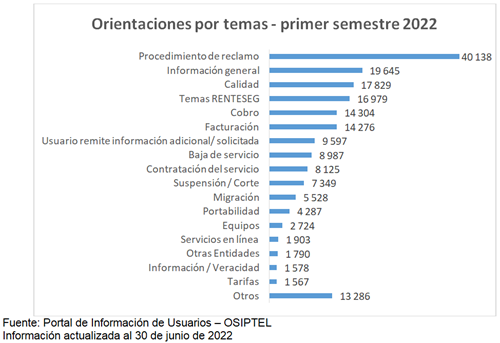 Durante el primer semestre del año, los temas que más orientación requirieron a pedido de los usuarios fueron sobre el procedimiento de reclamo con 40 138 (21.1 %), información general con 19 645 (10.3 %), calidad del servicio con 17 829 (9.4 %), sobre bloqueos de equipos terminales móviles vinculados al Registro Nacional de Equipos Terminales Móviles para la Seguridad (RENTESEG) con 16 979 (8.9 %), cobros con 14 304 (7.5 %), facturación con 14 276 (7.5 %), principalmente.