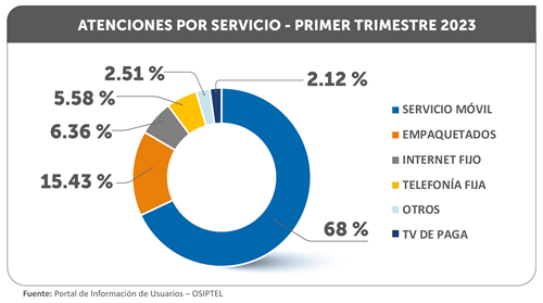 En el primer semestre de 2023, de las orientaciones que el OSIPTEL atendió a solicitud de los usuarios, 116 268 (68 %) trataron sobre el servicio móvil; mientras que 26 386 (15.43 %) corresponde a servicios empaquetados, ,10 868 (6.36 %) a internet fijo, 9542 (5.58 %)a telefonía fija, 3632 (2.12 %) a televisión de paga y 4285 (2.51 %) a otros servicios.