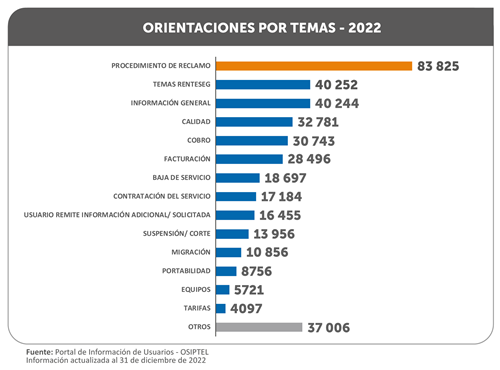 Con respecto a los temas que más orientación requirieron a pedido de los usuarios, en primer lugar, se ubicó el procedimiento de reclamo (83 825). En segundo lugar, estuvieron los temas de RENTESEG (40 252). Le siguieron información general (40 244), calidad del servicio (32 781), cobro (30 743) y facturación (28 496). En cuanto a empresas operadoras, la mayor cantidad de consultas en el 2022 correspondió a usuarios de Movistar (189 652), seguido de Claro (56 932), Entel (49 732), Bitel (11 500), entre otros.