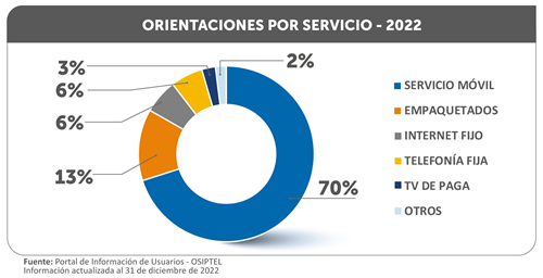 Según el Portal de Información de Usuarios del ente regulador, el 70 % de orientaciones (228 855) que el OSIPTEL atendió a solicitud de los usuarios, de enero a diciembre del 2022, trataron sobre el servicio de telefonía móvil. Otro de los servicios con más orientaciones, fue sobre empaquetados (43 017), que representó el 13 %, seguido internet fijo con un 6 % de orientaciones (20 631), telefonía fija con 6 % (19 377) y televisión de paga con 3 % (8198).