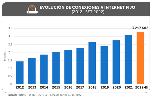 La conectividad de los peruanos a través del servicio de internet fijo sigue creciendo. A setiembre de 2022, se contabilizaron 3 217 602 conexiones en servicio, lo que representó un avance de 5.1 % respecto a setiembre del año previo, informó el Organismo Supervisor de Inversión Privada en Telecomunicaciones (OSIPTEL).