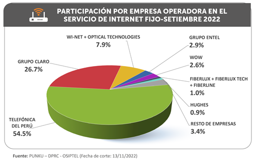 De este modo, Telefónica del Perú continuó liderando el mercado de acceso al servicio de internet fijo con una participación del 54.5 %, seguida por Claro (26.7 %), el grupo de empresas Wi-NET y Optical Technologies (7.9 %), el grupo Entel (2.9 %). Le siguen Wow (2.6 %), el grupo conformado por las empresas Fiberlux, Fiberlux Tech y Fiberline (1.0 %) y Hughes (0.9 %).