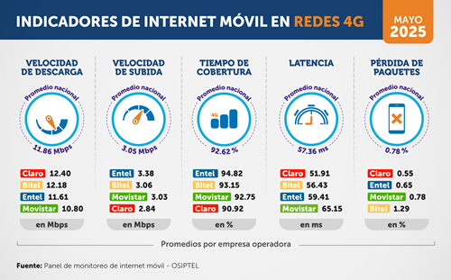 La velocidad promedio de descarga del servicio de internet móvil en redes 4G alcanzó los 11.86 megabits por segundo (Mbps) en mayo, informó el Organismo Supervisor de Inversión Privada en Telecomunicaciones (OSIPTEL). Esta cifra representa una mejora respecto a abril, cuando se registró un promedio de 11.82 Mbps.