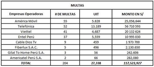 Por su parte, América Móvil (Claro) suma un total de S/ 25 056 644 (5,828 UIT) en multas por haber brindado el servicio de telefonía móvil en equipos con IMEI reportados como robados. También por no realizar las devoluciones a los usuarios como consecuencia de interrupciones presentadas en los servicios, dentro del plazo establecido