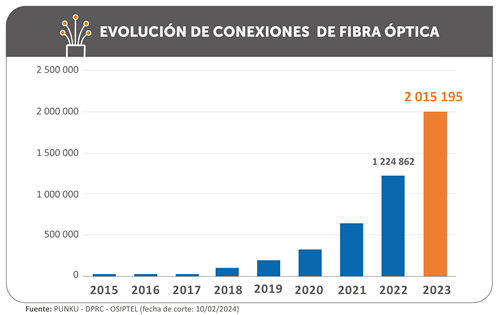 De acuerdo con la herramienta informática PUNKU, al cierre del 2023, se evidenció un crecimiento de 64.52 % de conexiones con fibra óptica, respecto al 2022, acumulando una tasa de crecimiento promedio anual de 85.97 % en los últimos cinco años.