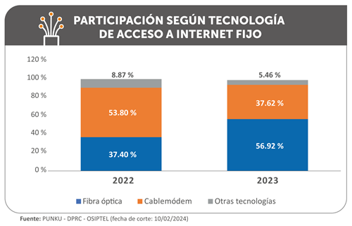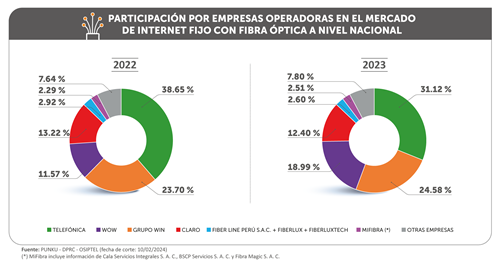 A diciembre de 2023, las conexiones de fibra óptica se consolidaron como el medio más utilizado para la provisión del servicio de internet fijo, representando el 56.92 % del total de conexiones del mercado. Por empresas operadoras, Telefónica reduce su participación, lo cual ha sido aprovechado, principalmente, por Wow y Grupo Win que consolidan su presencia, sobre todo, fuera de Lima.